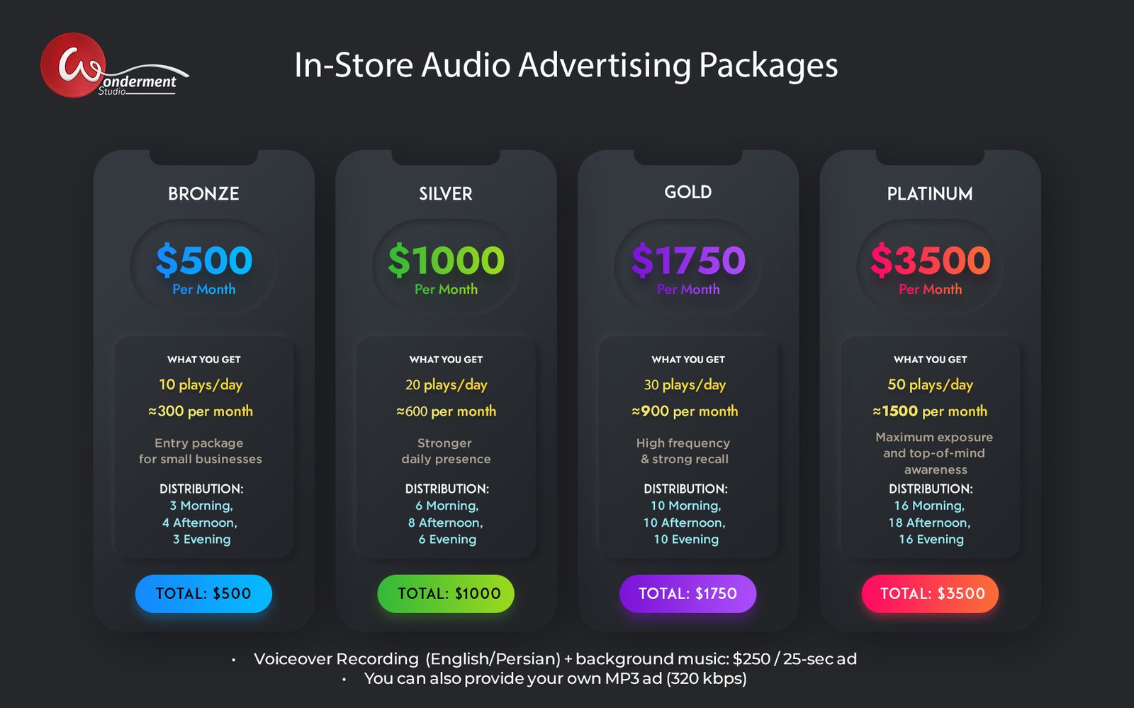 -Depending on your package, your ad will be heard 10 to 50 times per day (≈300 to 1,500 times per month).